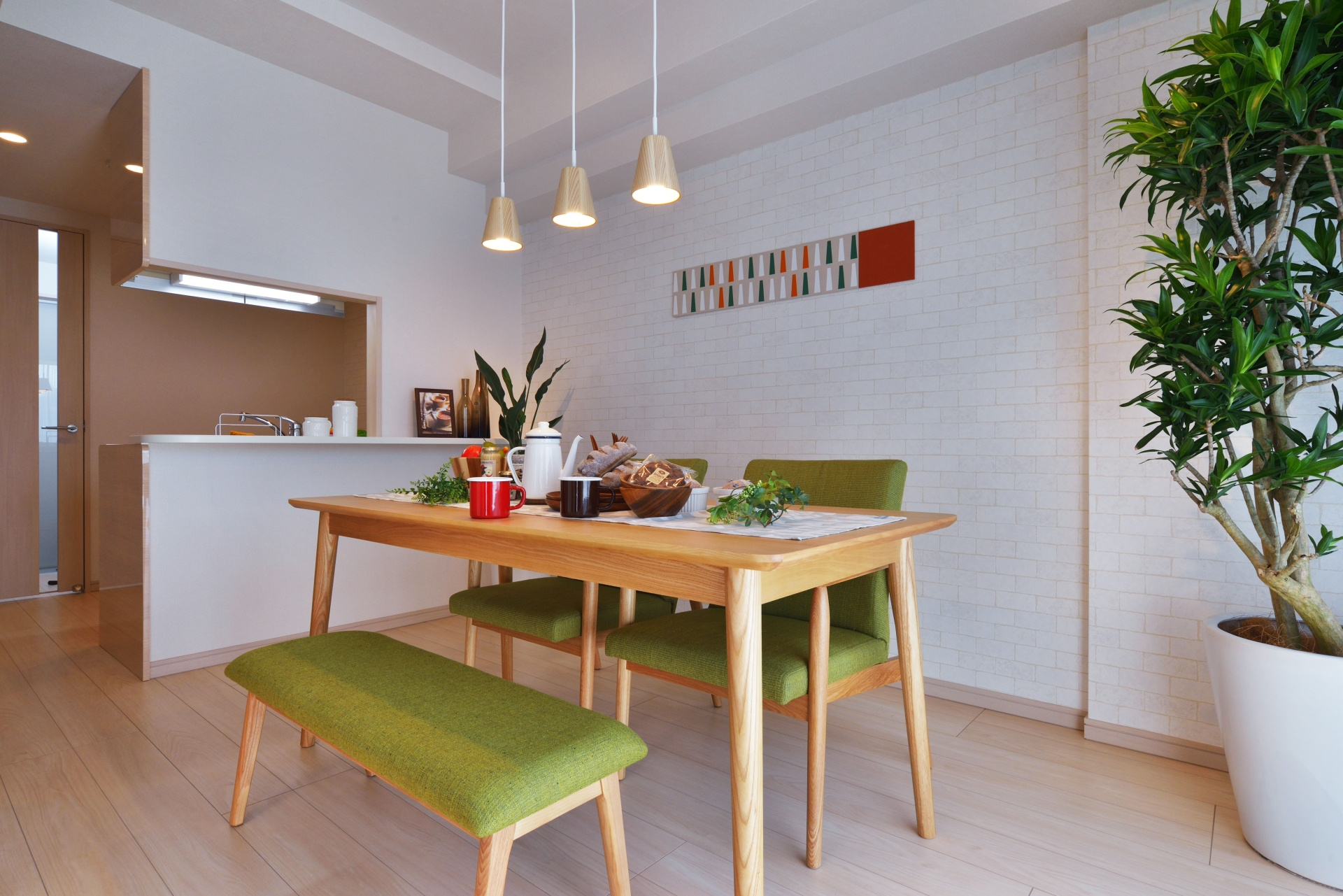 | 北欧 | 白木の床、淡色ファブリック、幾何学柄ラグ、観葉植物 | 明るく温かい雰囲気を自然素材で表現 |